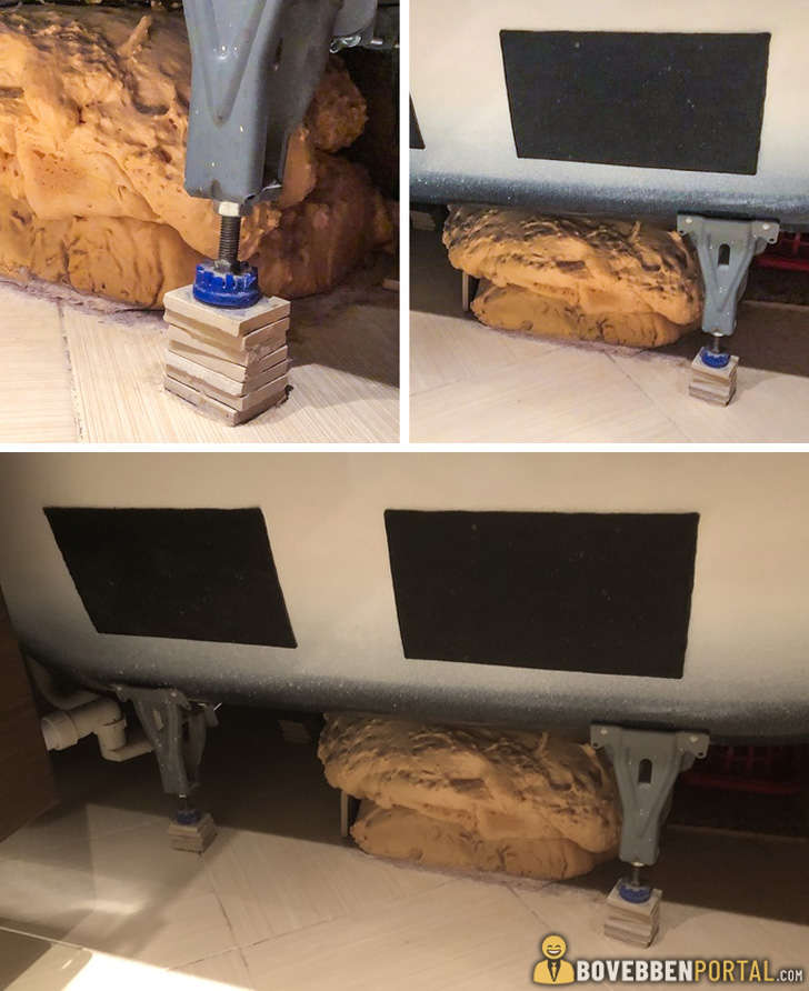 4, A házunk egyik lakója nem bírta kivárni míg a szerelő kiér és beszereli a kádat ezért ő maga oldotta meg poliuretán hab és téglák segítségével. Elmondása szerint évek óta meg sem mozdul neki és kifogástalanul működik.