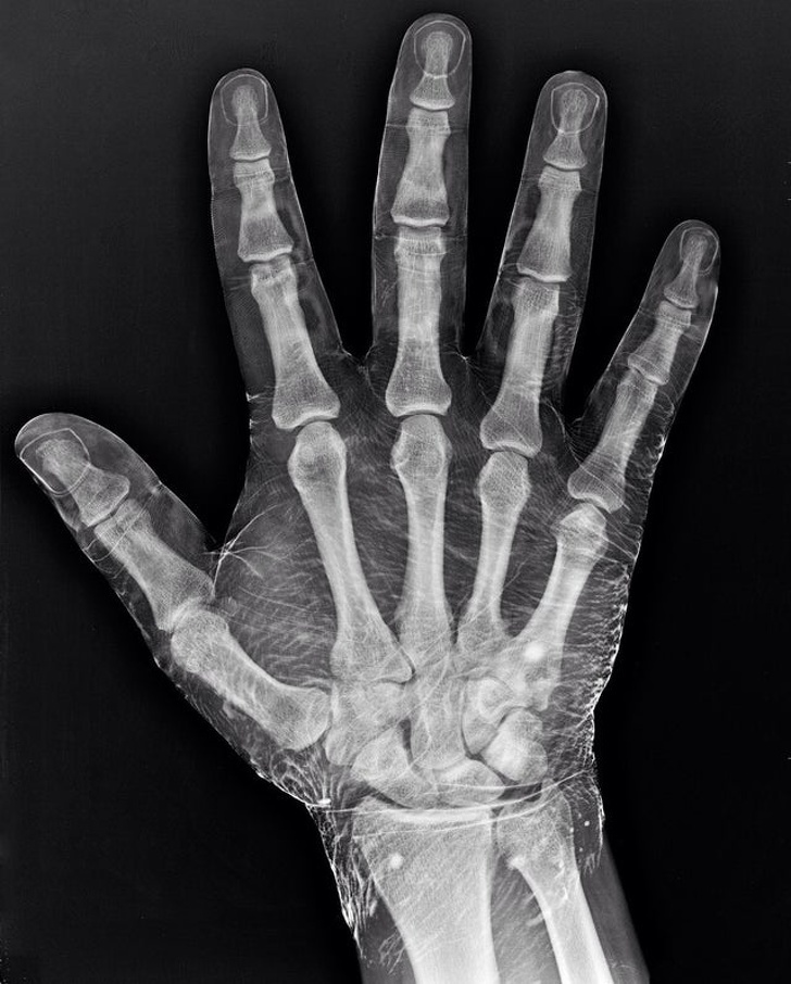10, Így néz ki egy jódba mártott kéz röntgenfelvételen. A bőr felszívja a jódot és sokkal átláthatóbb lesz az egész felvétel.