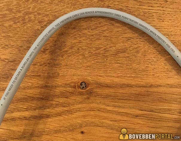 13. Erre a kábelre a következő szöveg van írva: “Ha meg kell kötöznöd a betörőket, amíg a hatóságok kiérkeznek, ezzel a firewire kábellel körülbelül három elkövetőt tudsz mozgásképtelenné tenni, ha megfelelően kötözöd le őket.”