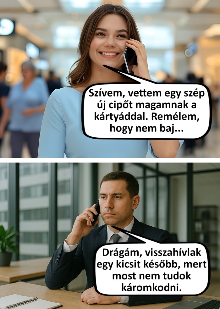 (3) Amit egy férfi mond a feleségének: Képzeld drágám, nagyon jó napom volt ma. A kolléganőmmel végre sikerült befejeznünk azt a nagy projektet, amit a főnök ránk bízott, és dicséretet kaptunk a munkánkért. Még egy előléptetést is kilátásba helyezett a számunkra.
