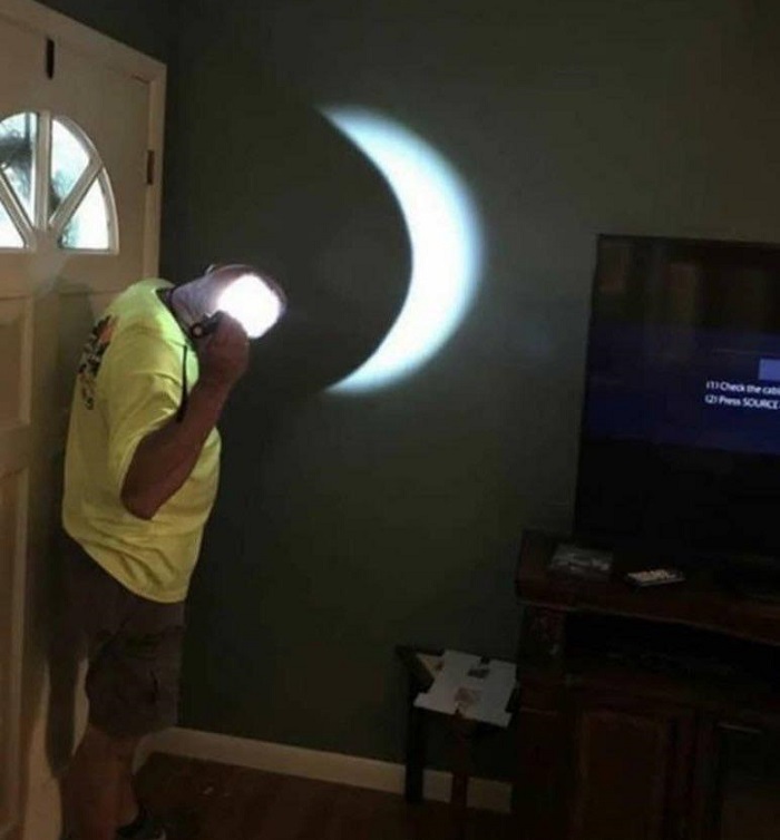 (13) Amikor hazaértem a munkából, a férjem azzal fogadott, hogy szeretne mutatni nekem valami érdekeset, amit most fedezett fel. Ezután elővett egy zseblámpát, amivel megvilágította a saját fejét, és így szólt: „Nézd, holdfogyatkozás!”