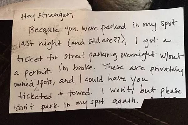 “Helló, idegen. Mivel este elfoglaltad a parkolóhelyem (amelyen még mindig állsz), az utcán voltam kénytelen parkolni, de megbüntettek, mivel nem volt rá engedélyem. Le vagyok égve. Mivel ez a hely magánparkoló, elvontathatnálak. Nem foglak, de kérlek, hogy többet ne parkolj a helyemre.”