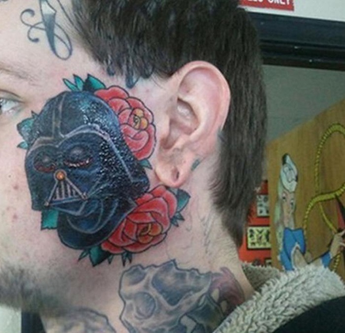 8. Egy Star Wars rajongó igazán „ízléses” tetoválást visel az arcán: Darth Vader vörös rózsák társaságában.