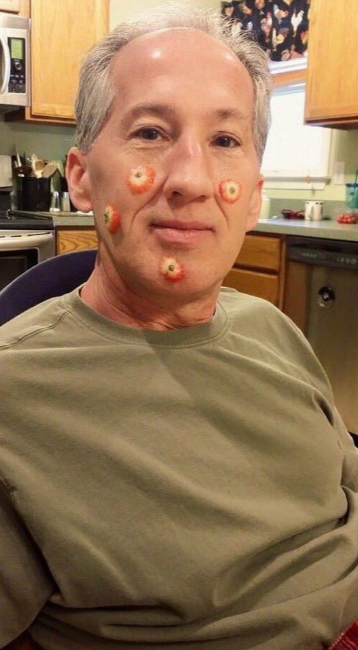 8. Az édesapám ezt a fotót küldte nekem, és azt fűzte hozzá, hogy nagy és csúnya pattanások jöttek ki az arcán reggelre. Amikor rémülten felhívtam, elárulta, hogy valójában csak epervégeket tapasztott az arcára, hogy megvicceljen engem.