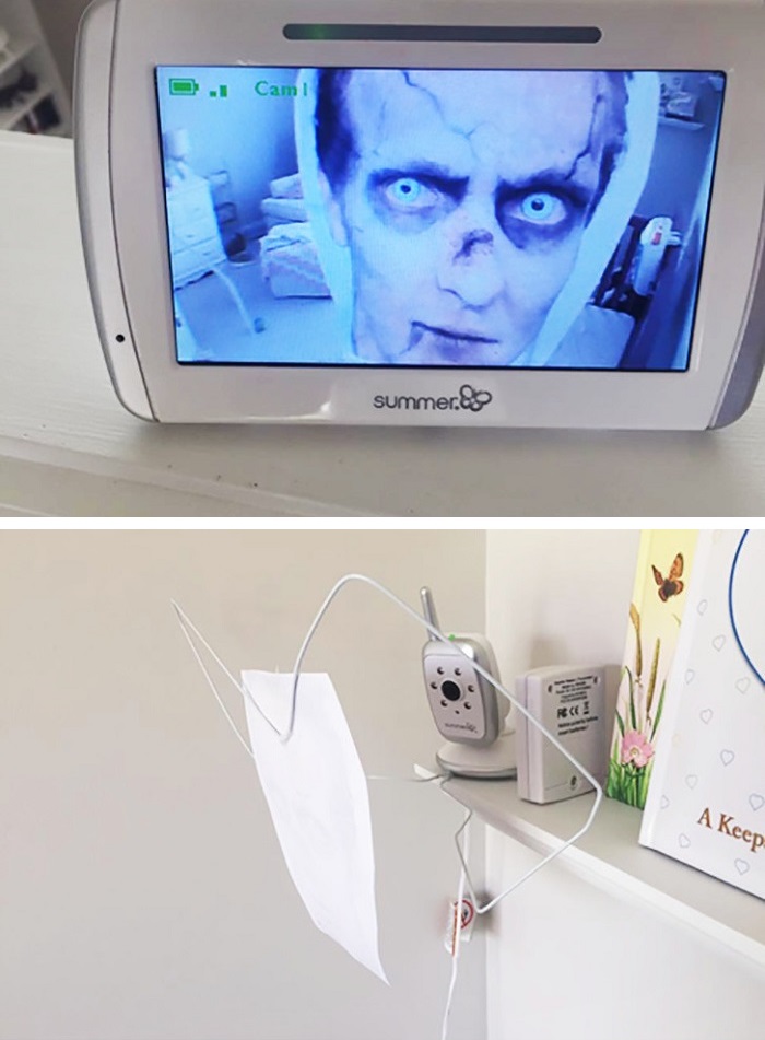 9. Egyik éjszaka felkeltem, hogy megnézzem a gyermekünket, és majd kiugrott a szívem a helyéről, ugyanis a drágalátos férjem egy zombit ábrázoló képet helyezett el a babafigyelő kamera elé: