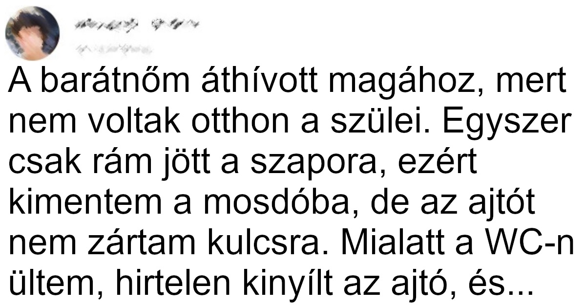 7. A barátnőm áthívott magához, mert nem voltak otthon a szülei. Egyszer csak rám jött a szapora, ezért kimentem a mosdóba, ám az ajtót nem zártam kulcsra. Mialatt a WC-n ültem, hirtelen kinyílt az ajtó, és ott állt velem szemben a barátnőm két méter magas, kigyúrt édesapja. Én meg összekuporodva, zavartan ültem a WC-n, és csak annyit tudtam mondani, hogy „Üdvözlöm, a lánya barátja vagyok! Örülök, hogy megismerhetem.” Majd pedig automatikusan nyújtottam a kezemet felé, mire ő: „Erre még visszatérünk, ha végeztél a dolgoddal, és kezet mostál.” Ezután pedig visszazárta rám az ajtót. Hát nem indult a legszerencsésebb módon a megismerkedésünk.