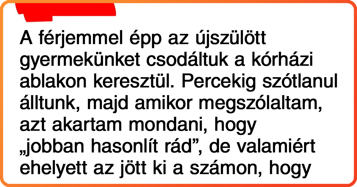A férjemmel épp az újszülött gyermekünket néztük a kórházi ablakon keresztül, és nem győztük csodálni őt. Hosszú percekig csendben figyeltük a gyermeket, majd amikor megszólaltam, azt akartam mondani, hogy „jobban hasonlít rád”, de nem tudom miért, véletlenül ez jött ki a számon: „valószínűleg a Tiéd…”.
