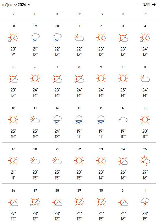 A hajnali minimumhőmérsékletek várhatóan 10-16 fok között alakulnak majd májusban. A hónap első felében a nyár elejét idéző melegre számíthatunk, hiszen a hőmérséklet 23-25 fok körül alakul.